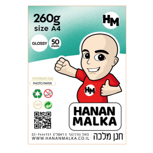 נייר פוטו מבריק A4 משקל 260 גרם, מארז 50 יחידות.