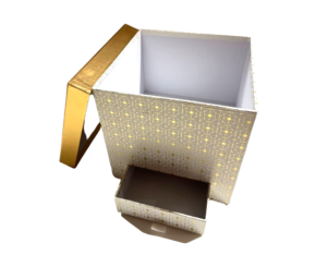 קופסה מרובעת בצבע לבן זהב עם מגירה