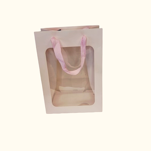 שקית נייר עם חלונית ידיות בד צבע ורוד בהיר
